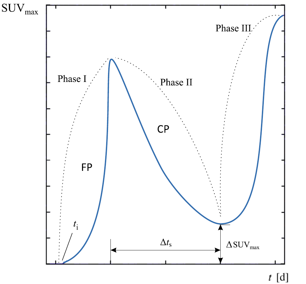 Figure 3. A representation of how a tumor progresses through the body. The proliferation phases I to III with metabolic tumor volume (SUVmax) versus time (t) are shown. Image taken from Ref. 3, which is licensed under a Creative Commons Attribution 4.0 International License. No changes were made to the image.